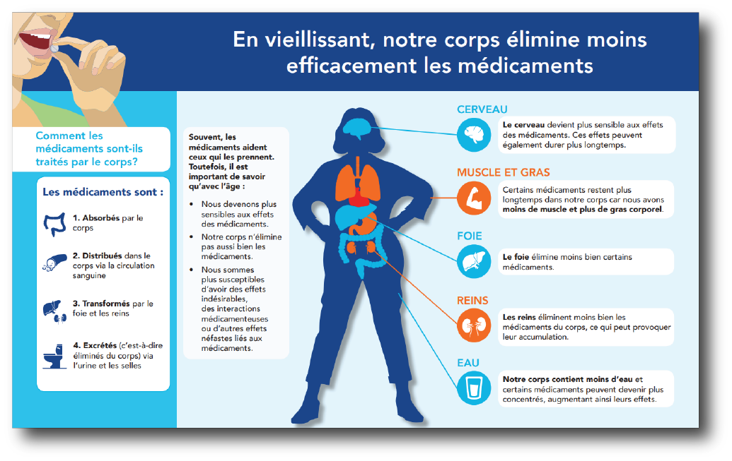 J'ai conçu cette brochure pour le Réseau canadien pour la déprescription afin d'expliquer comment notre corps change avec l'âge et l'impact que cela a sur l'efficacité et la sécurité des médicaments. Elle met en avant des facteurs importants tels que les modifications du métabolisme, du fonctionnement des organes, et le risque accru d'effets secondaires, en soulignant l'importance d'une gestion attentive des médicaments au fil du vieillissement.